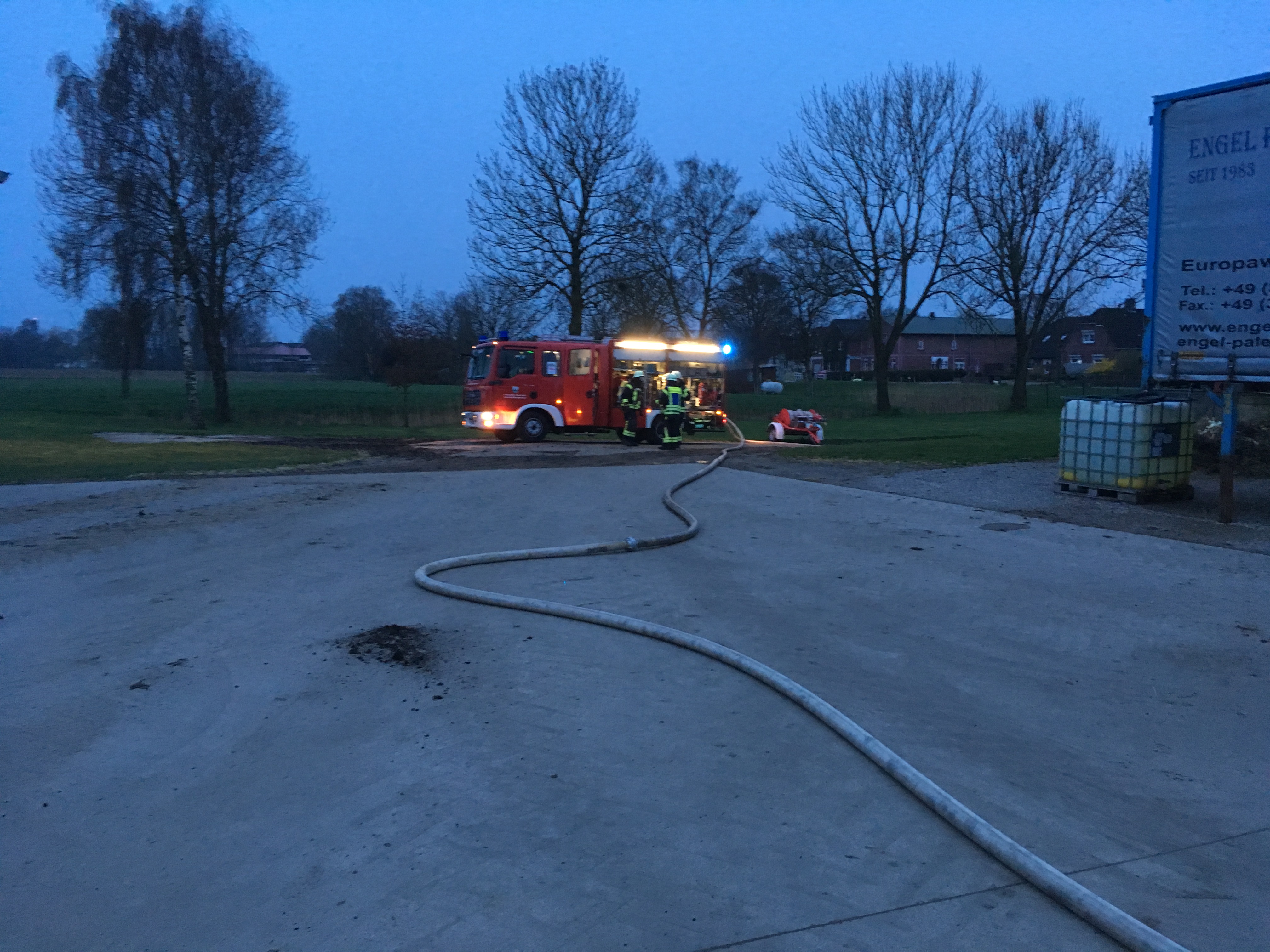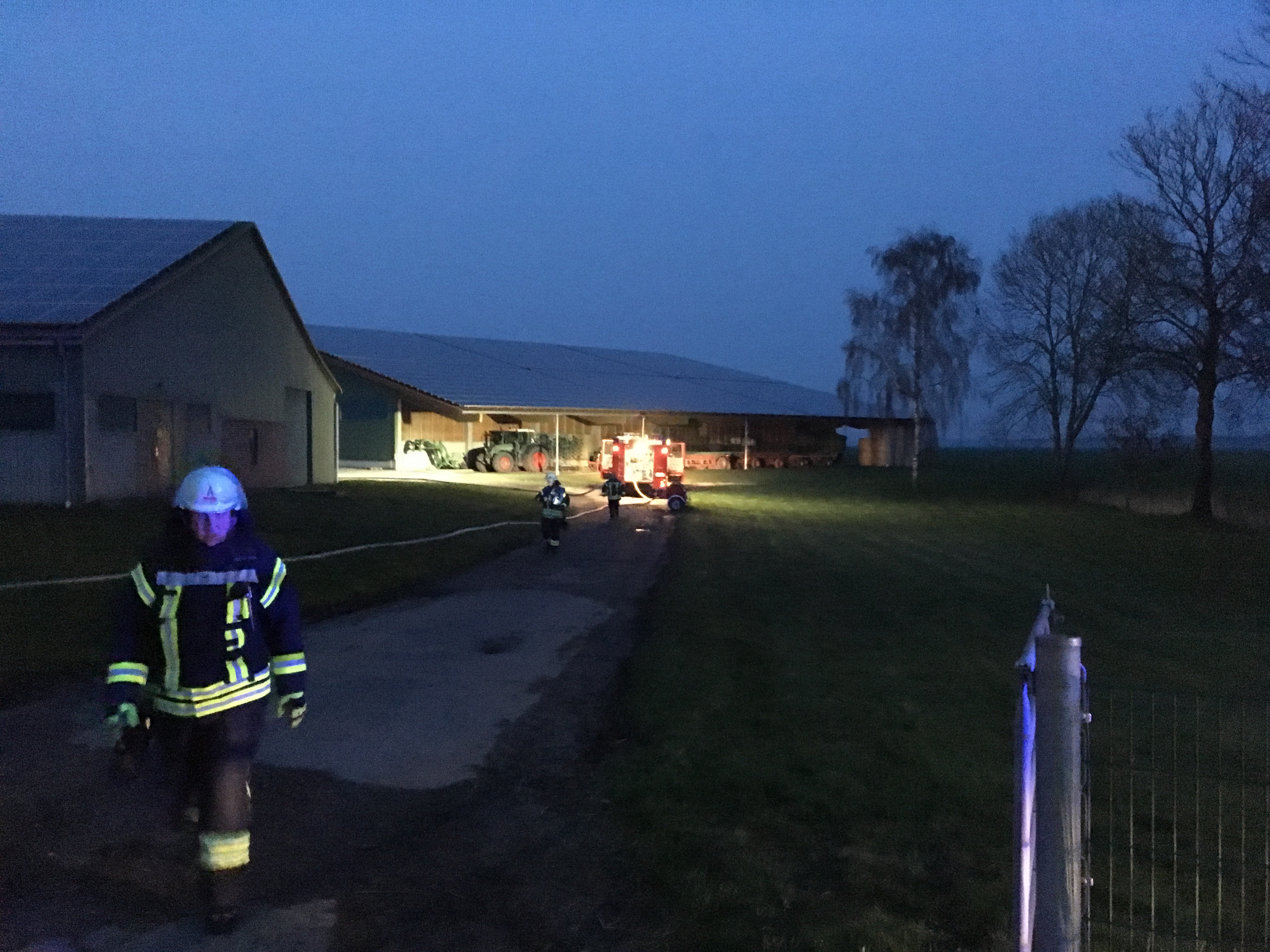 Die Übungsalarmierung erschien auf unserem Alarmmonitor sowie auf den Handys über unsere Einsatzapp. Daraufhin rückten wir zu einem landwirtschaftlichen Betrieb aus. Dort sollte laut Szenario ein Trecker in einer Halle brennen. Gruppenführer Jesko Lehmann erkundete nach Absprache mit Einsatzleiter Mike Wulff das Übungsobjekt.